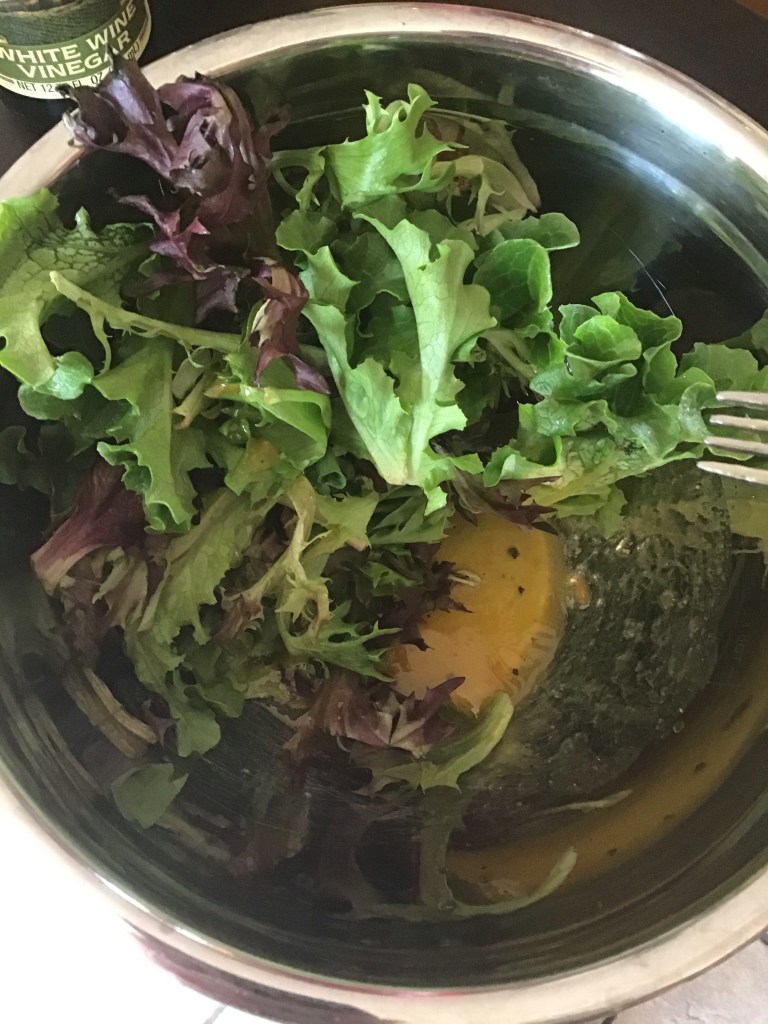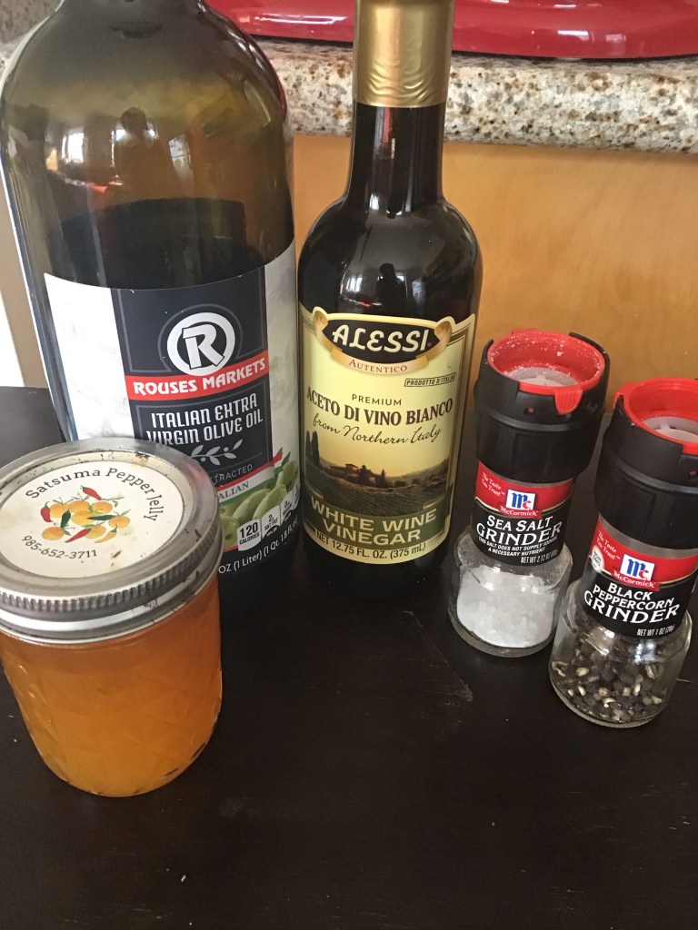 This is a good way to use up novelty jams that you may buy in the spur of the moment. I used Satsuma Pepper Jelly….whereas it sounded delicious at the farmers market…it doesn’t compel me to spread on toast. Mixed with vinegar, a little oil, salt and pepper however and it makes a pleasant dressing to a spring mix or spinach based salad.