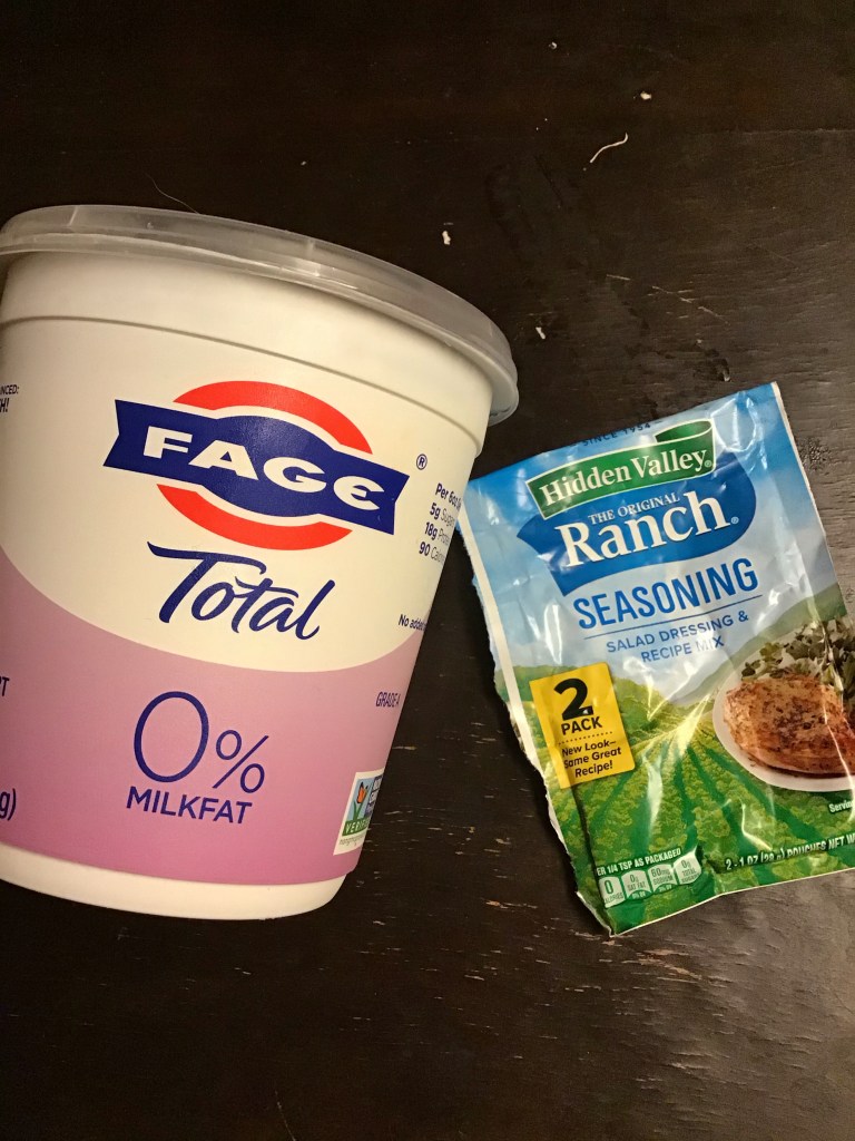 1. Substitute Greek Yogurt for Creamy Dressings! Low fat Greek Yogurt is protein rich leading to a sense of fullness. When I am looking for a quick, low maintenance dressing or dipping sauce for my salad or veggies I turn to Greek yogurt+pre-mixed packets. Ranch…creamy Italian….or another seasoning blend….it can be made quickly and easily and without guilt. The packet includes instructions of 1 cup of mayonnaise and 1 cup of milk….but I have found Greek Yogurt and water will create a consistency I like!